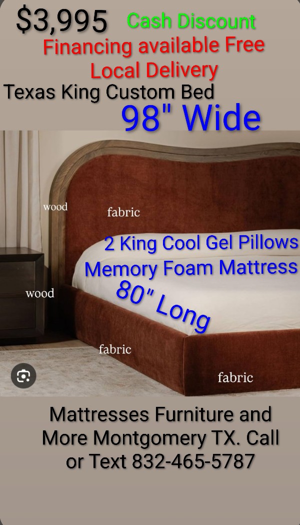 CLOUD DARK GRAY FABRIC 121”L X 76”D X 34”H - $798OverSized Chaise Lounge Dimension 67” x 67” 30”H - $750MANHATTAN DARK ORANGE 121”L x 82”D(CHAISE) x 33”H - $999 QUALITY, enthusiasm, and outstanding customer service. Special Offer TEXAS KING SIZE BED Queen bed, Dresser, Mirror, Night, Stand - $699 5 Piece Queen Set - $799 and King Set - $899 HH530GREY Full Queen - $149 Full King $199 OverSized Chaise Lounge Dimension 67” x 67” 30”H - $750 CLOUD DARK GRAY FABRIC 121”L X 76”D X 34”H - $798 CLOUD LIGHT GRAY FABRIC 121”L X 76”D X 34”H - $798 Heat and Massage - $599 Heat and Massage, Walnut -$599 Heat and Massage, Walnut -$599 Twin - $179 , Full - $239, Queen - $289, King - $389 Sealy® Posturepedic Plus Hybrid, High Point Soft Queen - $1799, King - $2499 Sealy posturepedic mattress Queen - $799, King-$1099 Sealy posturepedic mattress Queen - $799 Beauty Rest Black Queen - $1999 Beauty Rest Black King - $2499 $1,000 OFF RETAIL PRICE NOW ONLY $1,995 FOR ALL 3 PIECES! Top Grain Leather Reclining with USB ports, Cup Holders and LED Under lights!